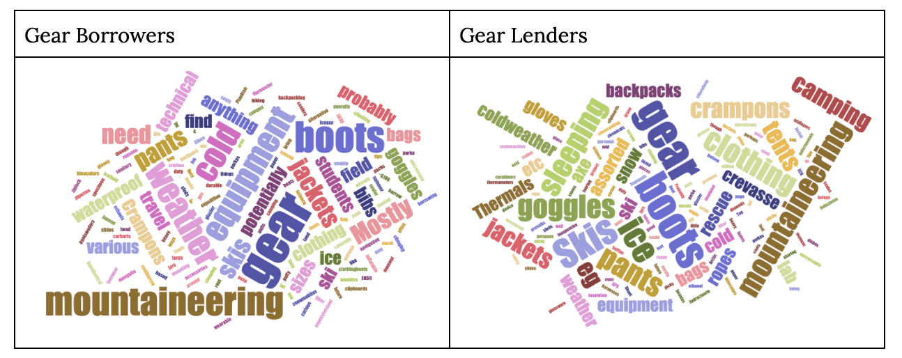 The word cloud below represents the type of gear survey respondents (n=25) are looking to borrow (n=22) vs. lend (n=20). The majority of respondents indicated the gear they would lend is new, slightly, or well used (94.7%).